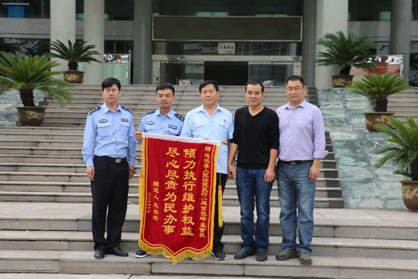 10月8日早上一上班,申请人赵某某及亲属即将一面书写“倾力执行维护权益 尽职尽责为民办事”的锦旗送到执行一庭执行干警的手中,以表达对执行干警牺牲国庆假期忘我执行工作精神的诚挚感谢!