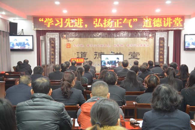 本期道德讲堂共有六个环节,分别是:唱一首歌曲,全体干警合唱《爱岗敬业歌》;看一部短片,观看微电影《利剑出鞘》;学习先进,李晓光和韩鑫两位法官先后上台作了发言;谈一番感悟,两位干警分享了内心感悟;听一场演讲,全体干警共同聆听了干警王轶作《立足岗位展风采 我为法院作贡献》的精彩演讲;送一份吉祥,党立新院长代表院党组为大家送吉祥春联。