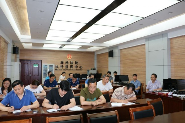 为进一步提升执行质效,深入推进基本解决执行难工作,2018年5月16日上午,河南省三门峡市渑池县人民法院党组书记、院长刘占军到该院执行指挥中心,督导检查决胜“基本解决执行难”工作。党组副书记、常务副院长陈明岚、党组成员、政治处主任茹育俊、党组成员、执行局长毛智伟、党组成员、办公室主任李明义及执行局全体人员参加会议。