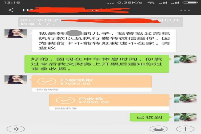 8月7日早上,执行法官起早将被执行人堵在家中,并将其依法传唤至法院。经执行法官向其耐心释法明理后,被执行人韩某峰仍找各种理由推脱,拒不履行义务。期间,韩某峰在外地打工的儿子得知父亲因拒不履行偿还义务被传唤至法院的消息后,主动联系执行法官,经与执行法官电话联系沟通,清楚了事情的原委,当即表示要替父亲履行偿还义务,同时请求执行法官对韩某峰暂缓实施拘留。并随后通过微信转账的方式履行了全部执行款,该案得以顺利执结。