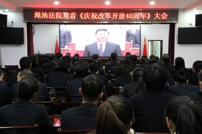 为致敬改革开放40周年,进一步引导党员干警不忘初心、牢记使命,12月18日上午,渑池县人民法院按照县委宣传部的统一部署,组织全体党员干警集中观看《庆祝改革开放40周年大会》,认真学习领会习近平总书记的重要讲话精神。