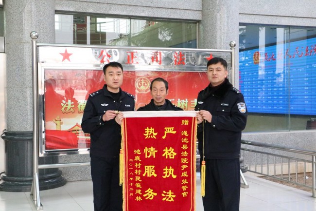 12月26日上午刚一上班,申请人崔某某冒着严寒手持“严格执法 热情服务”的锦旗便来到渑池县人民法院,表达他最诚挚的谢意。他说:“我是一个农民,我不知道该怎么表达我现在的心情,我没想到这么快你们就把钱要回来了。要不是你们把钱帮我要回来,我这次住院连看病的钱都没有,感谢你们,感谢渑池法院!”