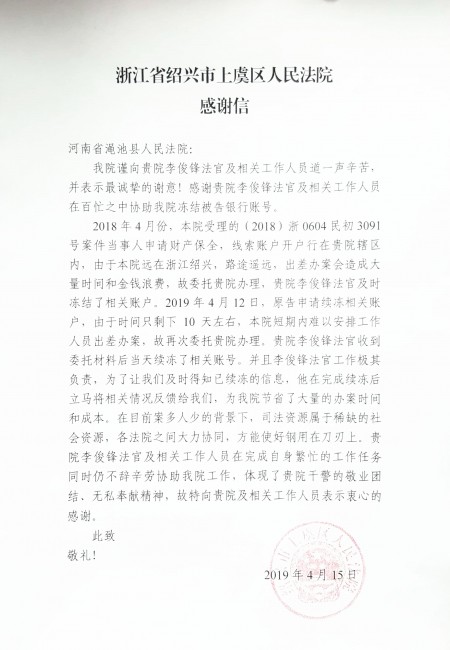 2019年4月30日,河南省渑池县人民法院党组书记、院长刘占军收到了来自千公里之外的浙江省绍兴市上虞区人民法院寄来的感谢信,信中对渑池县法院给予地大力支持和积极配合表示了衷心的感谢。