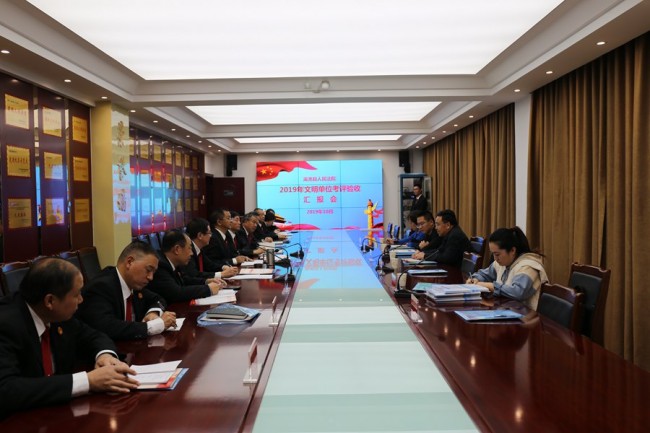 检查组一行实地走访察看了院内绿化环境、创建活动展板、职工室外健身园地、篮球场、职工食堂、一楼宣传大厅、诉讼服务中心、志愿服务站、文明实践站、职工书屋、活动中心、荣誉室等法院场所。汇报会上,检查组一行观看了渑池法院创建省级文明单位专题宣传片《书写司法文明新篇章》。之后,渑池法院党组书记、院长刘占军向检查组一行详实汇报了该院创建省级文明单位工作情况。