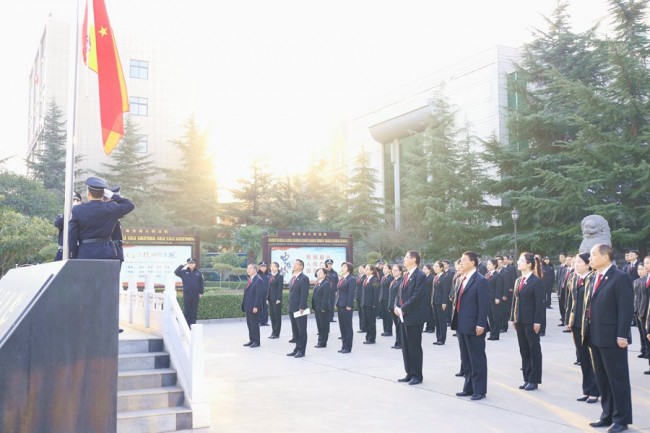 上午八时三十分,全体党员干警在审判大楼前排列成整齐的方队。随着国歌奏响,五星红旗冉冉升起,全体党员干警向国旗行注目礼,向伟大祖国致敬。