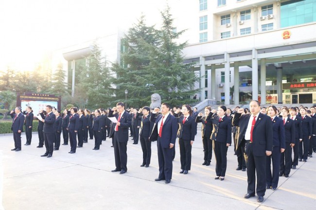 接着,由刘占军院长带领全体干警举起右拳,庄严宣誓:“我宣誓:忠于中华人民共和国宪法,维护宪法权威,履行法定职责,忠于祖国、忠于人民,恪尽职守、廉洁奉公,接受人民监督,为建设富强、民主、文明、和谐、美丽的社会主义现代化强国努力奋斗!”