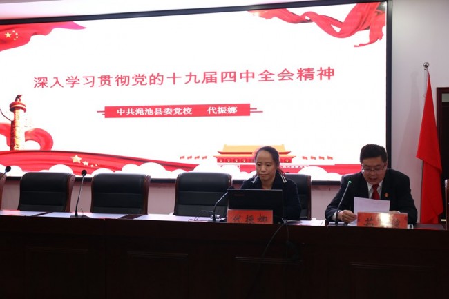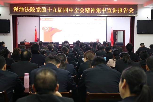 为深入学习宣传贯彻党的十九届四中全会精神,引导全院党员干警准确领会、全面把握党的十九届四中全会精神的思想精髓、核心要义,引导全院干警把思想和行动统一到全会精神上来,按照县委宣传部统一安排部署,12月5日上午,渑池县法院举行党的十九届四中全会精神集中宣讲报告会。渑池县委宣讲团成员、县委党校高级讲师代振娜向与会人员宣讲了党的十九届四中全会精神,渑池县法院全体党员干警参加了宣讲报告会。报告会由党组副书记、政治部主任茹育俊主持。