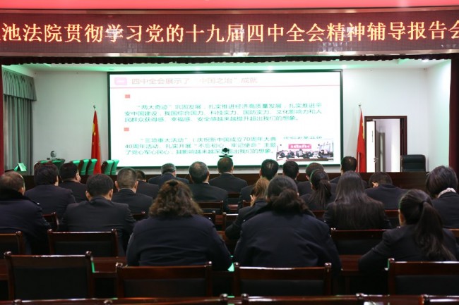 会上,中央宣讲团成员、中央政法委秘书长陈一新作辅导报告。在辅导报告中,他紧紧围绕学习贯彻习近平总书记在党的十九届四中全会上的重要讲话和全会精神,系统介绍了四中全会的时代背景、重大成果、重要意义、总体要求和总体目标等,从展示了“中国之治”成就、描绘了“中国之治”愿景、彰显了“中国之治”优势、部署了“中国之治”任务、激发了“中国之治”能力等五个方面进行了全面准确、深入浅出的宣讲,具有很强的思想性、指导性、针对性、实践性,对于法院干警更加深刻领会全会精神,不断把学习贯彻工作推向深入,具有重要指导意义。