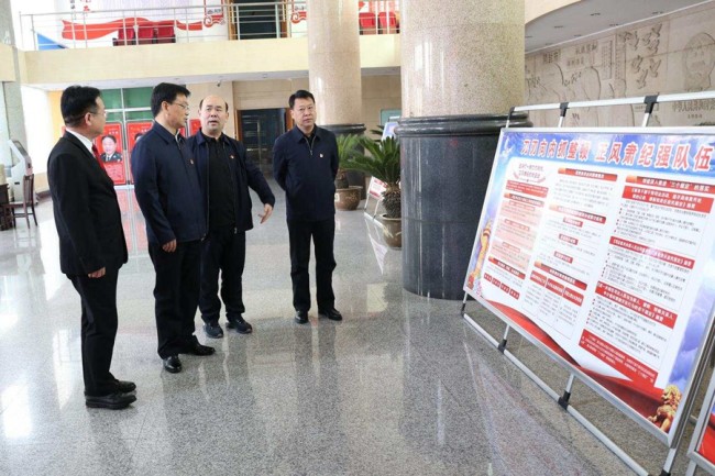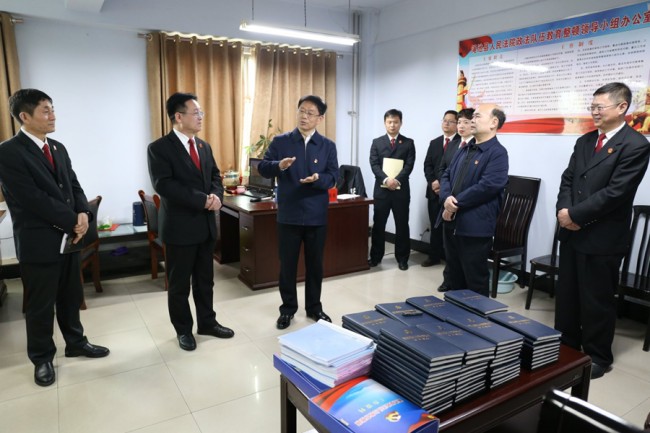 杨跃民一行实地查看了政法队伍教育整顿宣传展板、学习园地,到院教育整顿领导小组办公室查看人员安排、制度上墙工作,翻阅干警学习笔记、心得体会和工作台账,与教育整顿办公室工作人员亲切交谈,详细了解了县法院教育整顿各项工作进展情况,并鼓励干警要增强信心,克服万难,坚决打赢政法队伍教育整顿攻坚战。