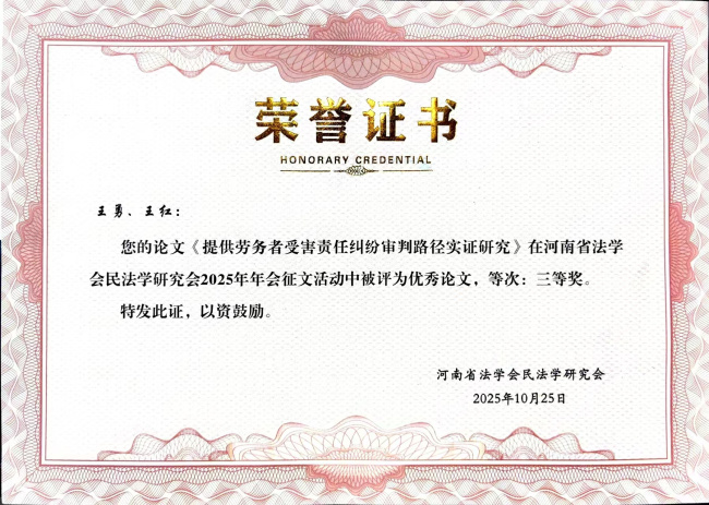 日前,渑池县法院干警王勇、王红撰写的论文《提供劳务者受害责任纠纷审判路径实证研究》,在河南省法学会民法学研究会2025年年会征文活动中荣获三等奖。